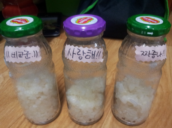 갓 지은 따끈한 흰 쌀밥을 유리 용기에 담아 하나는 이뻐~ 사랑해!! 보고싶었어.. 등등 긍정적인 말만하고 다른 하나는 못생겼어. 저리 가. 보기싫어. 등 부정적인말만 2주에 걸쳐 들려 주었답니다.